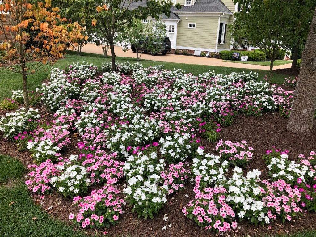 Multi colored Annual Vincas go perfectly in any flower bed.