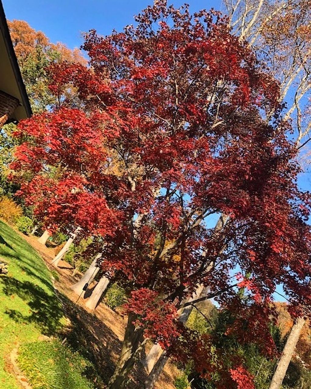 The burgundy Japanese Maple ‘Bloodgood’ turns a brilliant scarlet in the Fall.